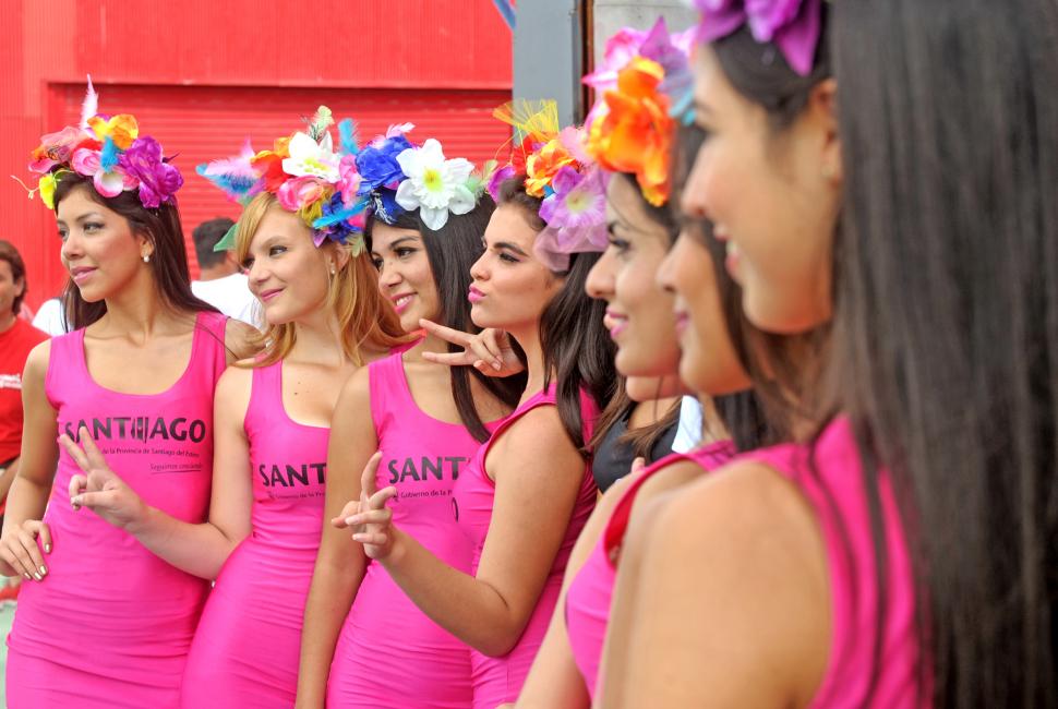Como es natural, la presencia de promotoras de todo tipo de empresas le aportan a cada competencia de automovilismo pistero una nota de color y frescura. Se destacaron las chicas que representaron a Santiago del Estero, enfundadas en vestidos rosados y con adornos florales en sus cabezas (foto). Todas recibieron piropos y, claro está, saludos por el Día de la Mujer