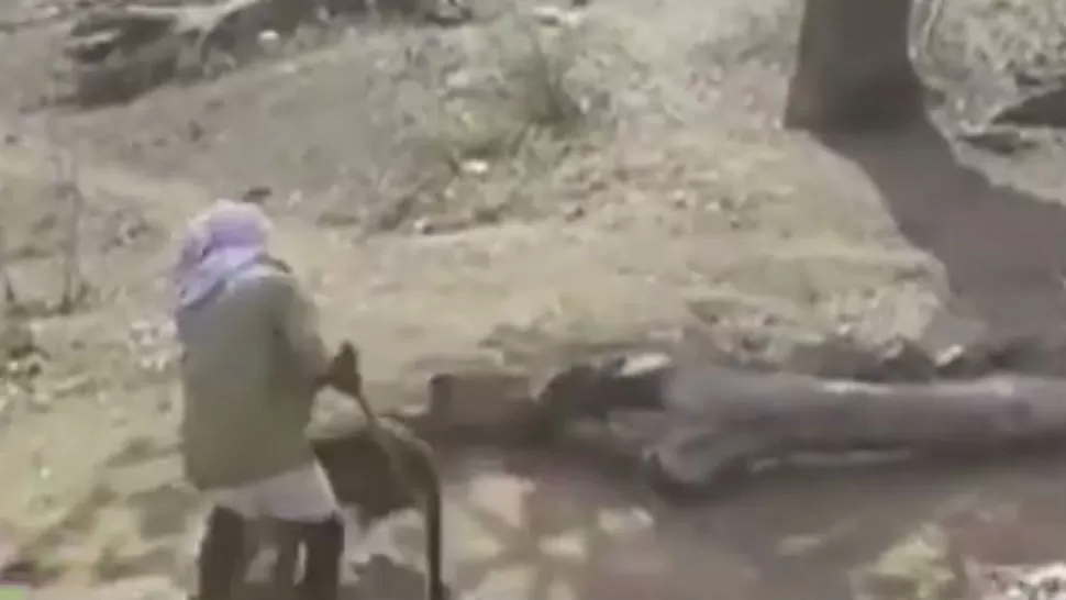 La batalla, que fue grabada con el celular de uno de los testigos, muestra al hombre defendiéndose de un agresivo leopardo con un simple palo.