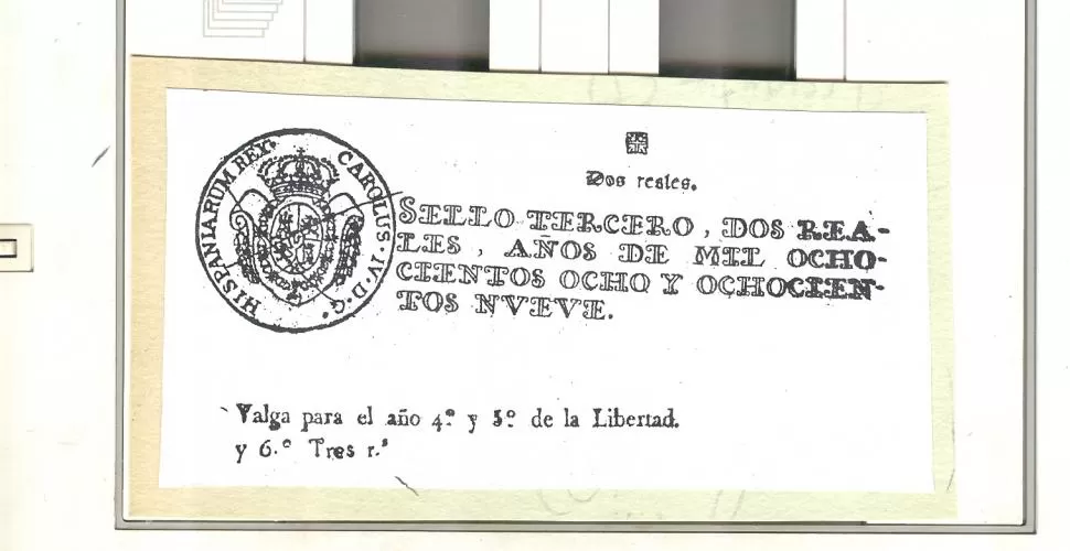 PAPEL SELLADO. En los años que siguieron a la Revolución de Mayo, el emblema real aparecía tachado y, debajo, la leyenda impresa “Valga para el año 4° y 5° de la Libertad” la gaceta / archivo