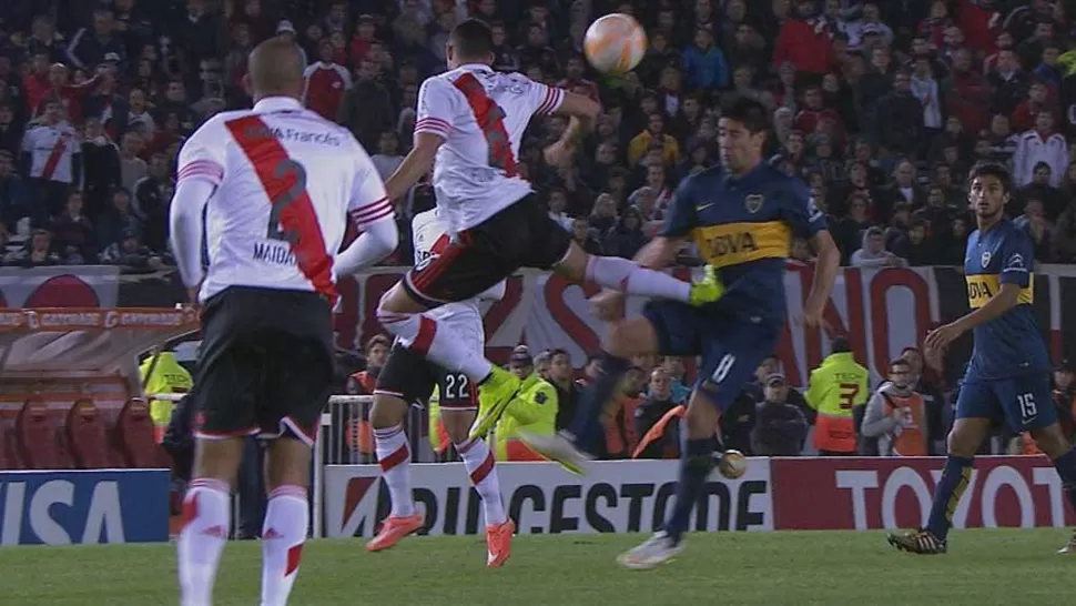 BUENOS AIRES.- La patada fue durísima, pero el árbitro mostró la tarjeta amarilla. El defensor de River Ramiro Funes Mori le pegó de lleno con su botín a Pablo Javier Pérez, en el partido de ida por los octavos de final de la Copa Libertadores. A los 10 minutos del complemento, ambos jugadores saltaron a disputar una pelota, y en el aire el hombre "millonario" estiró su pierna, golpeando al volante "xeneize" en su abdomen. A pesar del exceso, el árbitro Germán Delfino amonestó a Funes Mori. La jugada fue una de las más polémicas del duelo, en el que se vio poco fútbol y mucho roce.