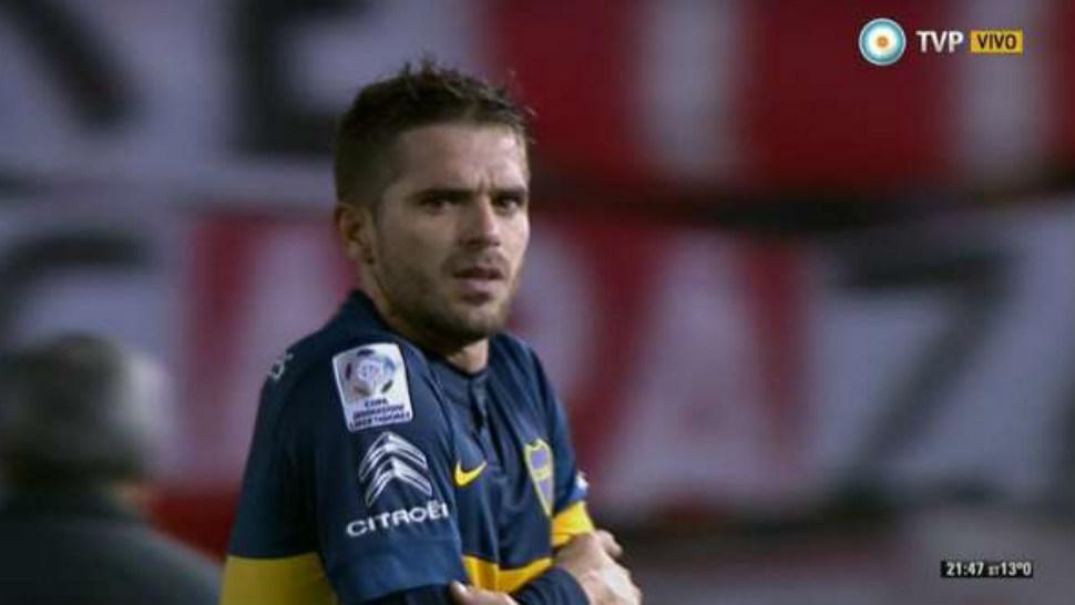 GESTO POLEMICO. Cuando se terminaba el primer tiempo el mediocampista de Boca, Fernando gago, aparentó "tener frío" mientras miraba hacia las tribunas donde se ubicaban los hinchas de River. CAPTURA DE LA TV