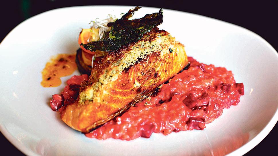 Plato principal: Salmón rosado en croûte cítrica, risotto de remolacha y tian de vegetales. El chef Luis Salguero ha calificado este plato como una de las estrellas del nuevo menú. Y tiene con qué. Una delgada costra cítrica envuelve la generosa porción de salmón rosado fresco y cocinado al grill. El sabor a citrus se cruza con el apaciguado dulce de la remolacha, que tiñe toda la porción de arroz. El tian de vegetales (rodajas horneadas con hierbas completan el equilibro en esta receta con olor, sabor y color mediterráneos. ($ 205)