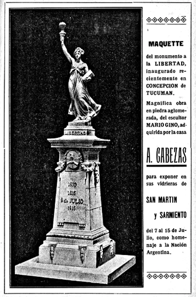 La imagen que acompaña esta nota es una publicidad aparecida, a página completa, en la revista “Fray Mocho” del 6 de julio de 1917. Se anuncia la exposición de la “maquette” de la libertad levantada en la plaza Bartolomé Mitre de Concepción. Como se puede leer es obra de Mario Gino y fue comercializada por la casa porteña de A. Cabezas. Esta “maqueta” (¿qué tamaño habrá tenido?) iba a ser expuesta en Buenos Aires, en la casa comercial.