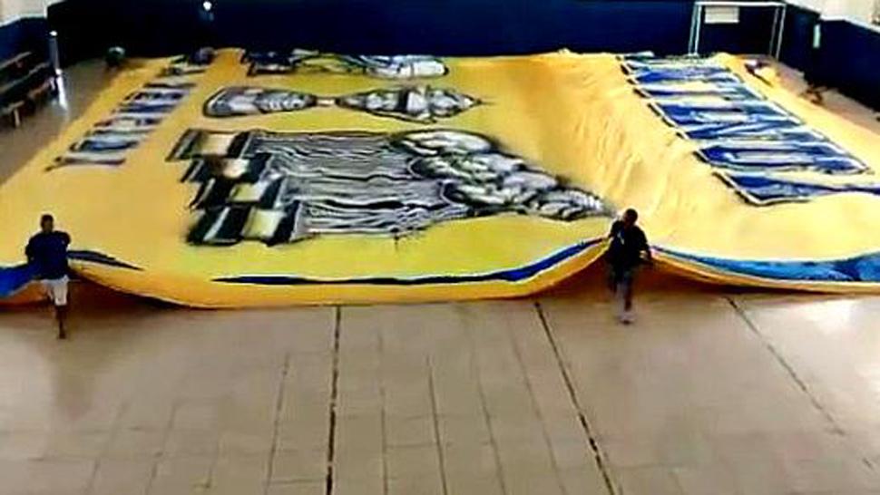 GIGANTE. La bandera que Tevez pagó para estrenar en La Bombonera. (FOTO TOMADA DEL TWITTER PASION AZUL & ORO)