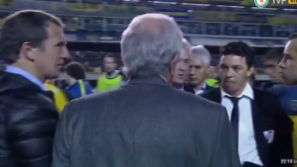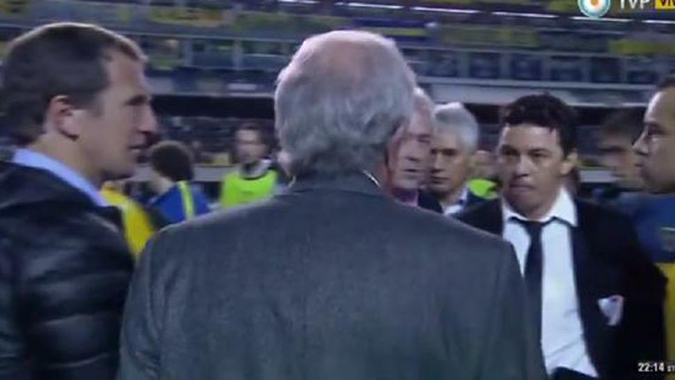 En este caso fue el técnico de Boca, Rodolfo Arruabarrena quien se molestó cuando el presidente de River, Rodolfo D'Onofrio, ingresó al campo de juego en un momento en el que no le correspondía, cuando aún se analizaba si el partido seguiría o no.