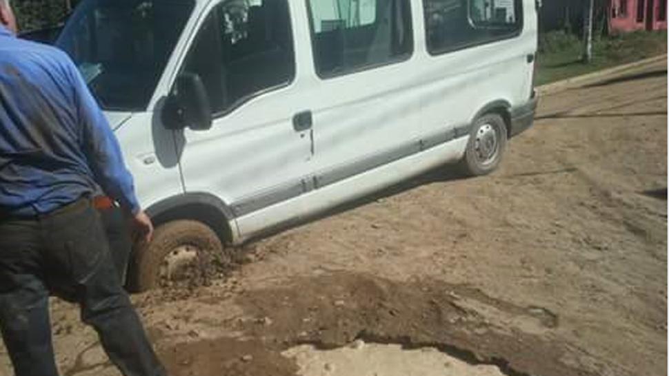 Una camioneta Renault Trafic quedó inmovilizada en una calle de tierra de Villa Carmela este viernes, debido a que una de sus ruedas se atascó en un pozo de grandes dimensiones. Un vecino fotografió el hecho y las envió al WhatsApp del diario. Señaló que además de problemas con las calles, padecen cortes de agua permanentemente y sufren la desaparición del delegado comunal Sangenis.