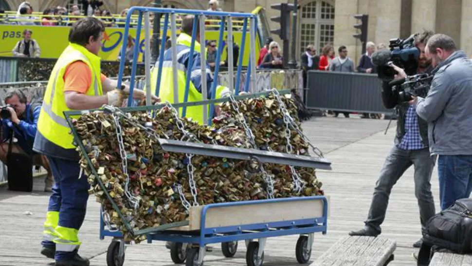 PARIS, Francia.- El peso del amor pone en peligro el célebre Puente de las Artes de París. El ayuntamiento de la capital gala empezó a retirar los cerca de un millón de candados que hay en las verjas del puente, el equivalente a más de 40 toneladas de metal.