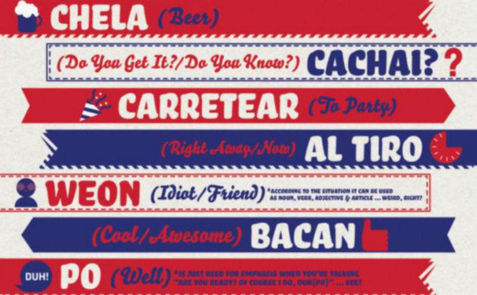 “Gamba” es una moneda de cien pesos. “Güeón fome” quiere decir aburrido. “Güeón seco” es un tipo muy bueno en lo que hace. “Al tiro” es lo mismo que decir “al toque”. “Dejar la escoba” significa estropear algo. “Chucha” es una exclamación, pero “sacar la chucha” es pelear y ganar.