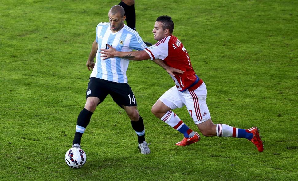 UN LÍDER MUY CRÍTICO. Javier Mascherano, que aparece eludiendo la marca del delantero Raúl Bobadilla, reconoció que la Selección tiene cosas por corregir. efe