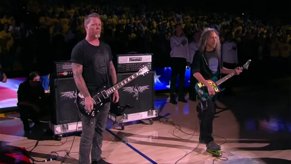 OAKLAND, Estados Unidos.- Dos de los integrantes de la mítica banda de heavy metal, Metallica, interpretaron anoche una versión instrumental del himno nacional de los Estados Unidos, minutos antes del inicio del quinto juego de la serie final de la NBA que disputan Golden State Warriors y Cleveland Cavaliers.