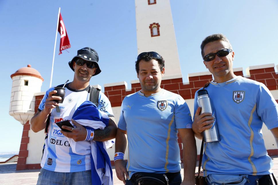Los hinchas uruguayos desplazados a La Serena para ver a su selección ante Argentina están indignados por no poder introducir al estadio La Portada el mate, su bebida “sagrada”, pues el termo que lo acompaña está catalogado como “como objeto contundente”. “El mate es vida, es nuestra razón social para charlar, comer. El mate no mata”, comentó un aficionado uruguayo de unos 30 años, quien enarboló la bandera de su país junto al emblemático faro Monumental de La Serena, enfrente del océano Pacífico.