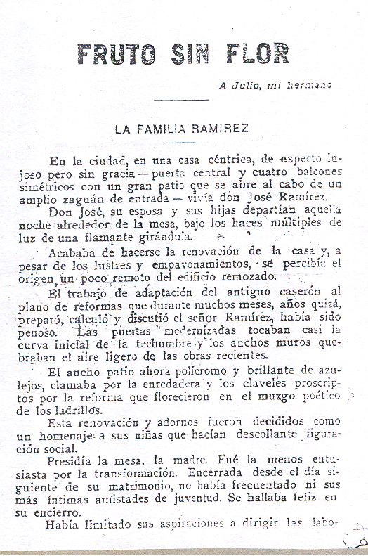 El primer título fue “Fruto sin flor”, de Juan B. Terán. “Me aventuro a decir, escrita unos veinte años antes del 15 de marzo de 1921, día en que salió a luz”. Se trataba de “cuadros de costumbres políticas tucumanas, con personajes fácilmente reconocibles”. Después “vendría, en el número 2, ‘El esposo espiritual’, de otro autor, que en el bizarro título de su obra se anunciaba como un superrealista, cosa asombrosa para esa época…”