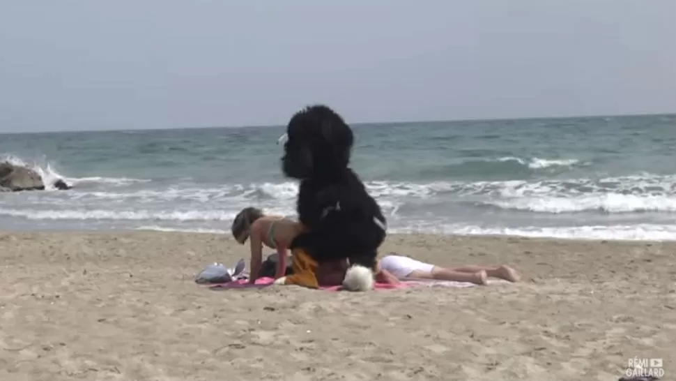 Gaillard grabó un video en el que se disfrazaba de perro y se dedicaba a molestar a varias personas haciendo lo que hacen los perros: jugar con un palo de madera, escarbar la arena en la playa, desenterrar huesos y hacer sus deposiciones.