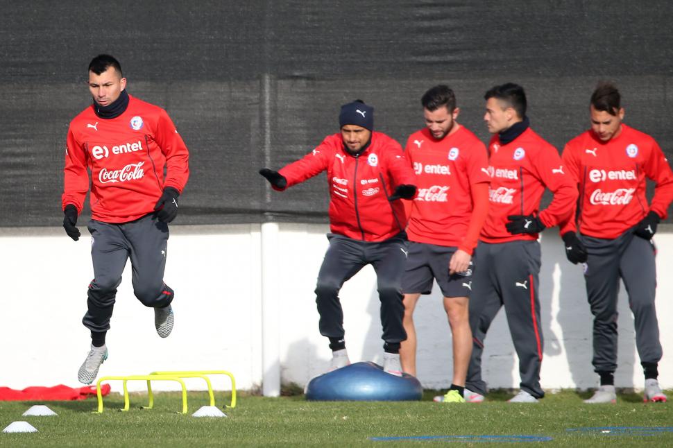 El plantel se entrenó ayer a puerta cerrada en el complejo de Los Llanos, cerca de La Serena, y para el partido de mañana contará con la vuelta de Diego Godín. (DPA y EFE)