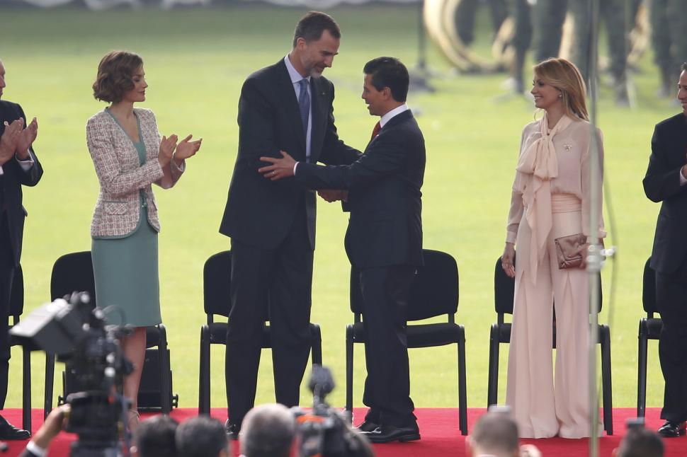Los reyes de España, Felipe VI y Letizia, fueron recibidos en México por el presidente Enrique Peña Nieto con honores militares y nombrados huéspedes distinguidos de Ciudad de México, al inicio de la primera visita de Estado que realizan en América. Después de colocar una ofrenda floral ante el altar de la patria, el Monumento a los Niños Héroes, los monarcas recibieron la bienvenida en el campo militar Campo de Marte entre salvas de cañón. Los monarcas españoles, que permanecerán en México hasta mañana, caminaron por una alfombra roja colocada sobre el césped del campo militar acompañados por Peña Nieto y su esposa, Angélica Rivera, tanto para los discursos como para presenciar un desfile militar. Peña Nieto, que el viernes fue sometido a una intervención en la cual le extirparon la vesícula, reanudó sus actividades con la bienvenida que le ofreció a los monarcas hispanos.
