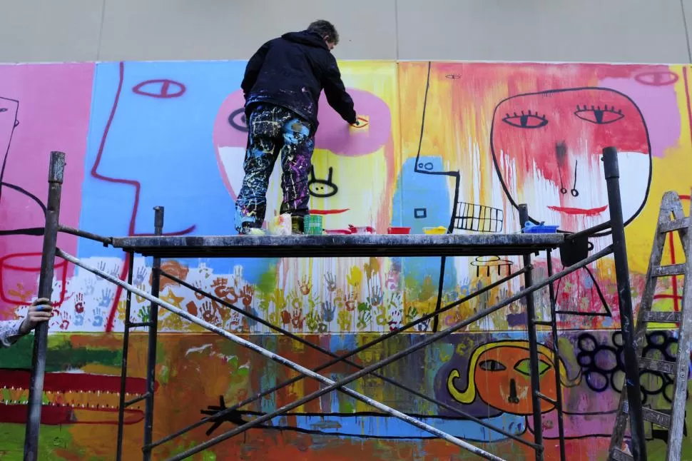 El plástico chaqueño pintó ayer un mural en el Hospital de Niños -sobre Chacabuco, casi Rondeau-, una de las actividades centrales de la movida artística Crea Tucumán, coordinada por la secretaria General de la Gobernación, Carolina Vargas Aignasse. No lo hizo solo: varios vecinos y fanáticos del artista (entre ellos, muchos niños) espantaron el frío y la neblina a pincelazos. “El arte modifica la vida de las personas. Y también el entorno del barrio: recuperamos una pared que era gris o que estaba tapada. Cambia la vereda y cambia el paso del peatón por ella”, dice Lockett, convencido, a LA GACETA.