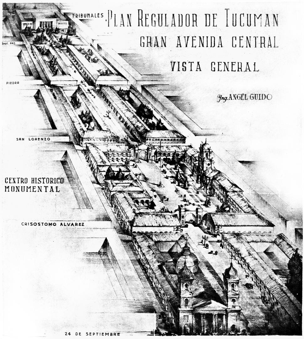 PROYECTO. Reproducción de una perspectiva de 1937 del tramo de la “Avenida Central”, tal como la ideó el ingeniero urbanista Ángel Guido. LA GACETA / ARCHIVO
