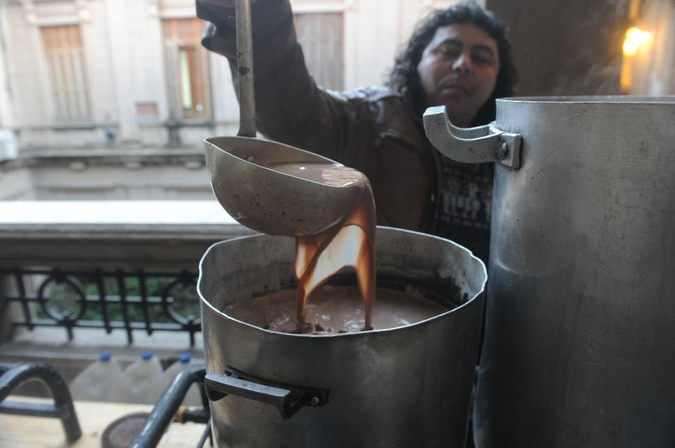 Graciela le dedica tiempo a la preparación del chocolate, cuya receta guarda, celosamente, en la memoria de su paladar. “Lleva mucho chocolate, mucha leche y bastante azúcar. Mi madre le decía ‘chocolate de cuchara parada’, porque debía ser espeso. Hacemos que se cocine bastante, que caliente bien. Para mí es muy importante que el sabor del chocolate me haga acordar a la niñez; eso busco cuando lo pruebo, y hasta que no encuentro ese gusto no paro; le agrego un poco más de leche, o un poco más de chocolate, hasta que llego a ese sabor”, contó, mientras daba algunas indicaciones a su equipo de trabajo. “En este caso utilizamos un cacao de buena marca, porque se disuelve mejor, se une mejor con la leche y tiene una mejor textura en la presentación”, añadió Graciela. Explicó que lo llevaron a Casa de Gobierno ya preparado, aunque frío: “acá sólo nos queda el trabajo de calentarlo, porque, si no, los tiempos no dan”.