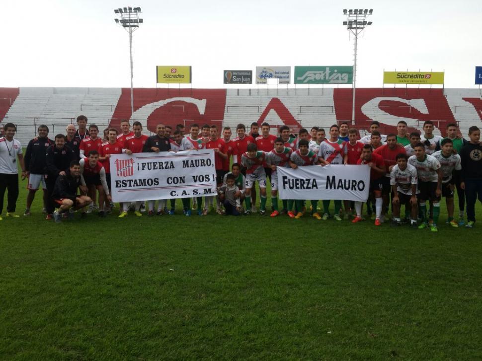 SOLIDARIDAD. Antes de los amistosos, los planteles de San Martín y de San Jorge posaron con banderas en apoyo al juvenil Mauro Ávila, que se encuentra enfermo. FOTO DE RaÚl Chalabe