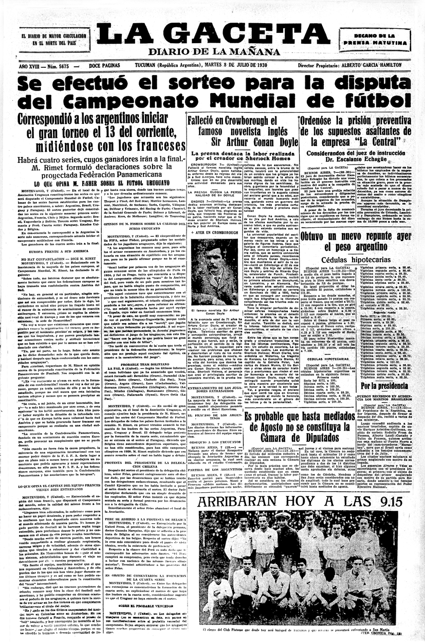 Corría el primer mes de 1930 y LA GACETA anunciaba que se había realizado el sorteo de los partidos a disputarse en el primer mundial de fútbol de la historia que se jugaría en las tierras del campeón olímpico, Uruguay. El debut de los albicelestes iba a ser con los galos. También mereció un lugar importante la muerte del escritor inglés Arthur Conan Doyle, creador del mítico detective Sherlock Holmes. La gran foto al pie de página anunciaba la presentación del reconocido equipo porteño de Platense en nuestra provincia.