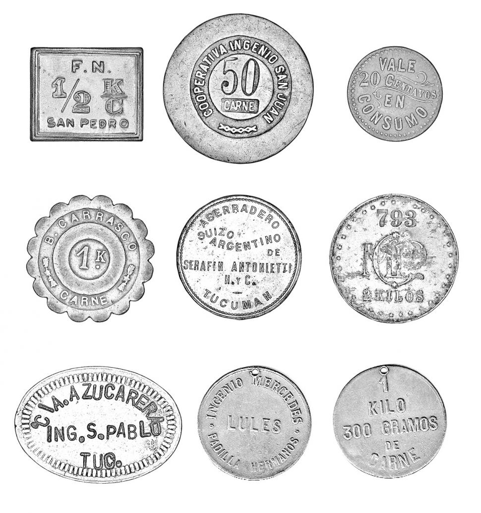 La ficha de FN, ½ KC, San Pedro (arriba a la izquierda), esta ficha cuadrada podría haber pertenecido a la proveeduría del agricultor Francisco Nelegatti, en la zona de SanPedro, Departamento Cruz Alta. No tiene fecha, es de cobre y tiene el reverso completamente liso. Ficha de ración del ingenio Mercedes (las dos últimas, de abajo al centro y a la derecha), grabado en el anverso, en el círculo: “Ingenio Mercedes - Padilla Hermanos”, y en el centro: “Lules”. Del otro lado, en el reverso, especifica que vale por “1 kilo, 300 gramos de carne”. El grabador de estas fichas fue Bellagamba y Rossi, una acuñadora de Rosario, de las más importantes que hubo en el país. Según Darío Sánchez Abrego, en su blog “Exonumia y Numismática”, estas fichas sirvieron entre 1900 y 1904. Eran una ración para el “obrero de cañera”. Cobraban unos 30 pesos mensuales y una ración diaria de un kilo trescientos gramos de carne, la misma cantidad de maíz y 3 galletas; sal, café y, en el invierno, caña (la bebida alcohólica) a razón de 1 litro cada 10 obreros”.