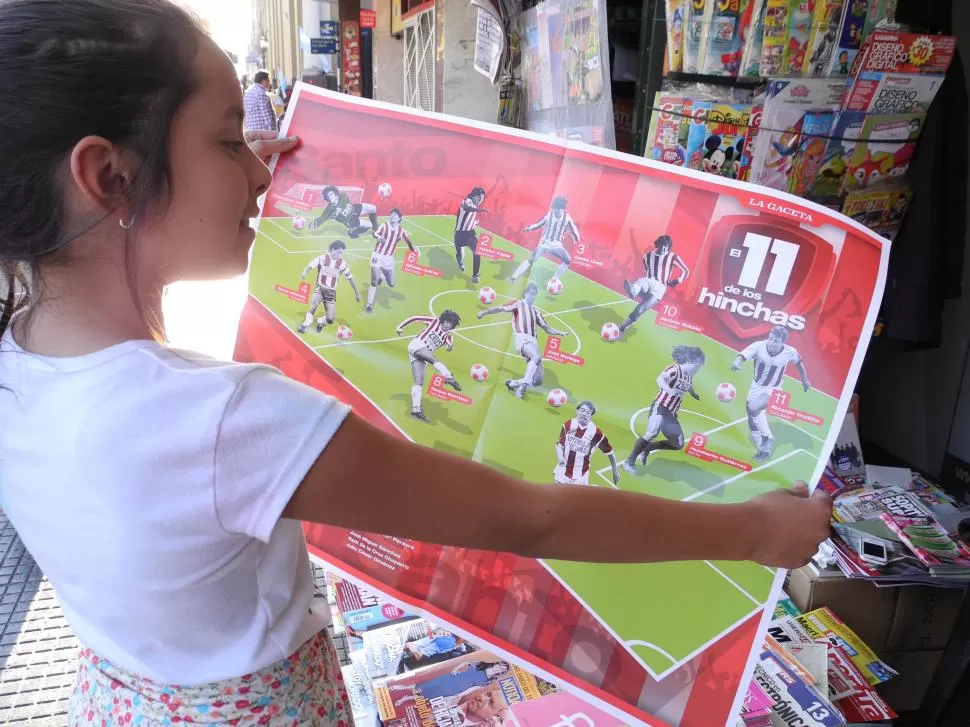 PARA GUARDARLO. Una simpatizante de San Martín observa la lámina que entregó ayer LA GACETA con el equipo de todos los tiempos del “santo”. la gaceta / foto de josé nuno