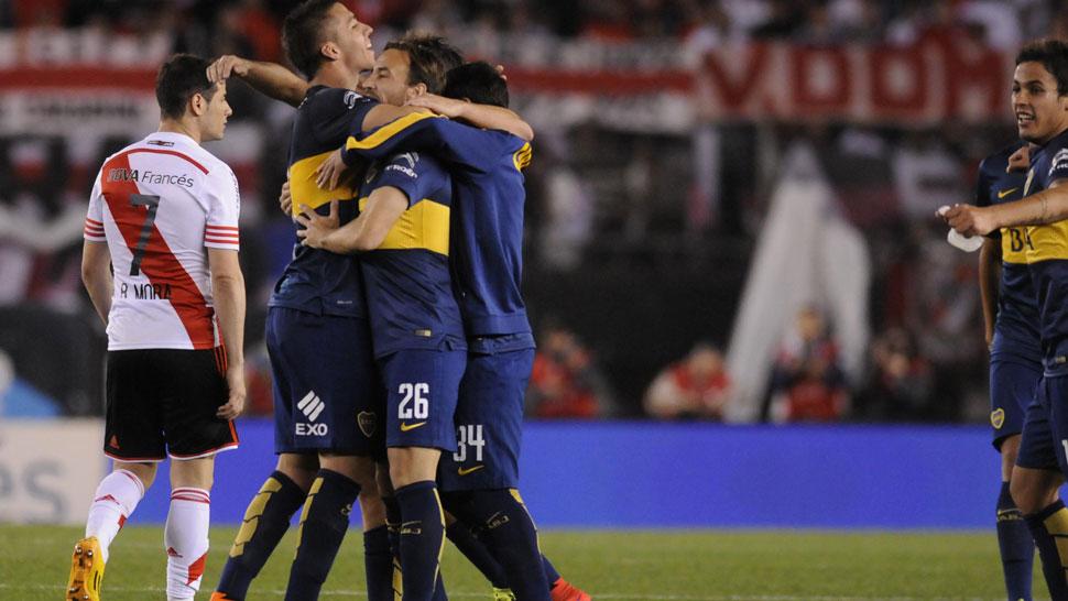 FELICES. Los jugadores de Boca celebraron ante el silencio de los de River. (DyN)