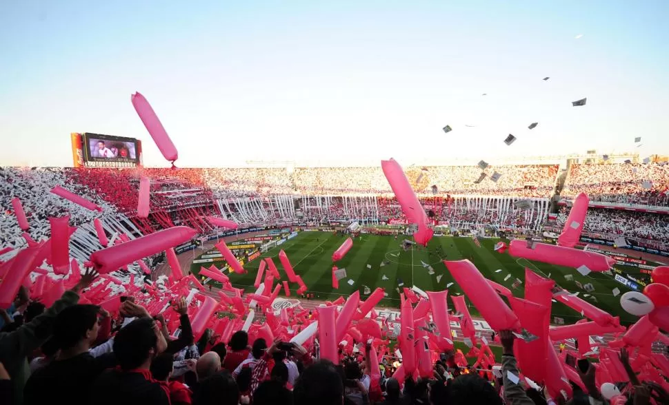ANTESALA. Los simpatizantes del “millonario” decoraron el Monumental con globos y cintas. Cuando salió el equipo a la cancha lo recibieron con una lluvia de papelitos. fotos de télam