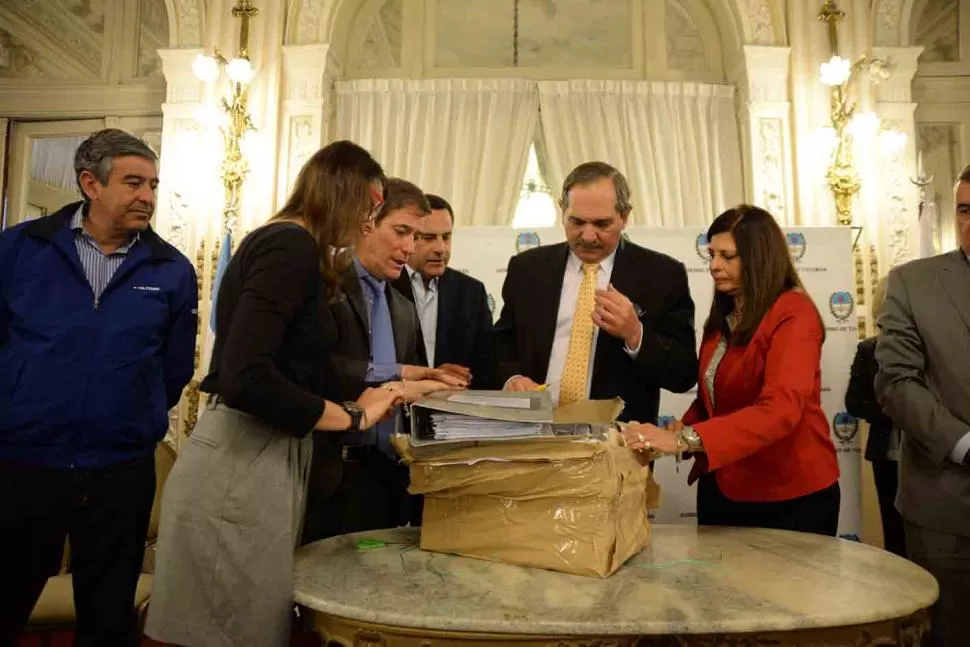 PLIEGOS. Alperovich (centro) abre los sobres, ante la mirada de funcionarios. prensa y difusión
