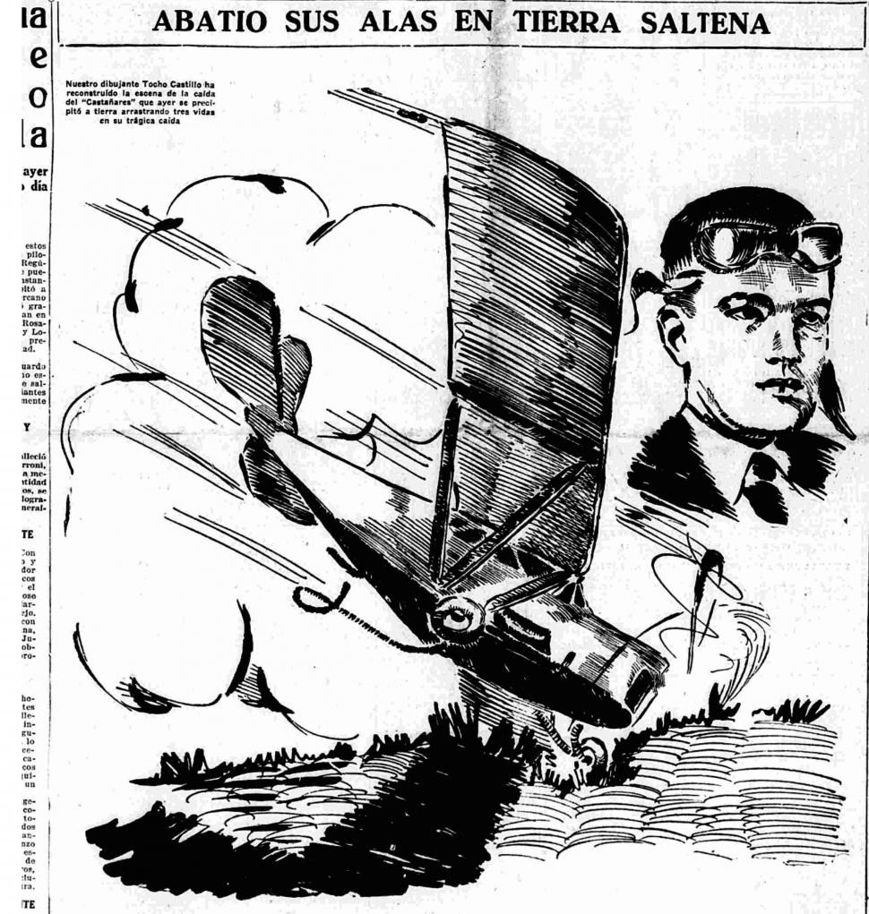 “Accedió gustoso, como era su costumbre”, relataba LA GACETA. Lupo y Pierroni subieron al avión. La crónica sigue así: “el decollage fue espléndido, impecable y se remontó rápidamente hasta los 100 metros para dirigirse a la ciudad. A las 12.15 el Castañares evolucionaba sobre el campo La Pólvora, cercano al matadero municipal, cuando al avión según testigos del vuelo, entró en violento tirabuzón precipitándose a tierra, sin observarse el menor indicio de estabilización del rápido descenso”. Un par de días más tarde el diario informaba que el accidente se produjo porque uno de los pasajeros se movió de tal manera que afectó ciertos elementos de vuelo de la nave que produjeron su caída, sin que el piloto pudiera hacer mucho debido a la baja altitud del vuelo. Los salteños se mostraron consternados por el deceso de Regunaga, una persona querida allí y que estaba por mudarse a Buenos Aires. Sus restos fueron trasladados hasta la metrópoli en tren. Su paso por Tucumán fue un acontecimiento, ya que los más reconocidos pilotos y aviadores locales, junto a autoridades del Aero Club, se dieron cita en la estación ferroviaria para rendirle honras al colega desaparecido.