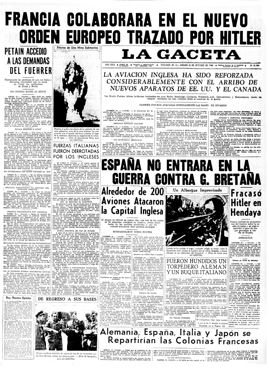 La tapa del 26 de octubre de 1940 estaba dedicada a la Segunda Guerra Mundial. Se informaba que la Francia de Vichy sería parte de los planes trazados por Adolf Hitler. Por otro lado, tras dos días de reuniones en Hendaya (Francia), el führer y Francisco Franco no llegan a un acuerdo. España no entra en el conflicto y no permite el paso de tropas germanas hacia Gibraltar. Londres es atacada por 200 aviones.