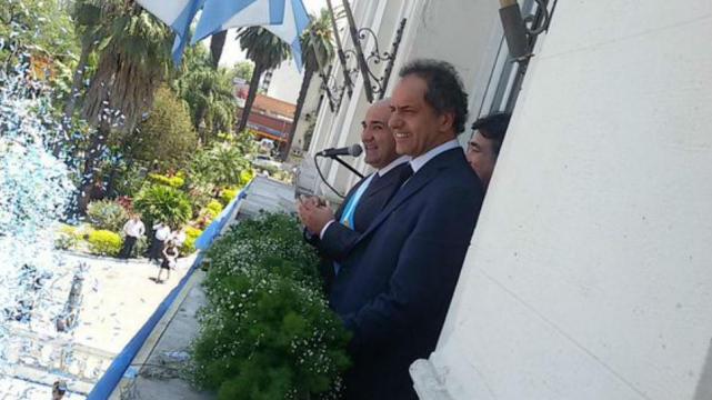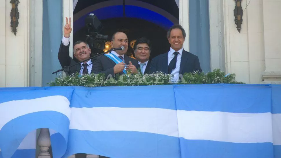 el acto de asunción de Juan Luis Manzur como gobernador, el mandatario provincial salió al balcón del teatro San Martín a saludar a los tucumanos. Allí estuvo acompañado por el candidato a Presidente por el Frente por la Victoria (FpV), Daniel Scioli, quien pronunció un breve discurso en el que pidió el apoyo del pueblo tucumano para el balotaje.