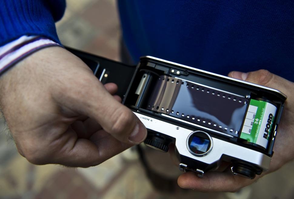 La película de 35mm debe ser cargada cuidadosamente tratando de no tocar su superficie para no dejar marcas. Para cargarla se tiene que abrir el respaldo de la cámara y engancharla en los engranajes adecuados.