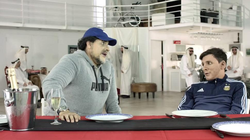 Acompañado por un grupo de jeques árabes, Maradona le recuerda a Messi que es el mejor del mundo, pero le suplica que gane algún título con la Selección Argentina.