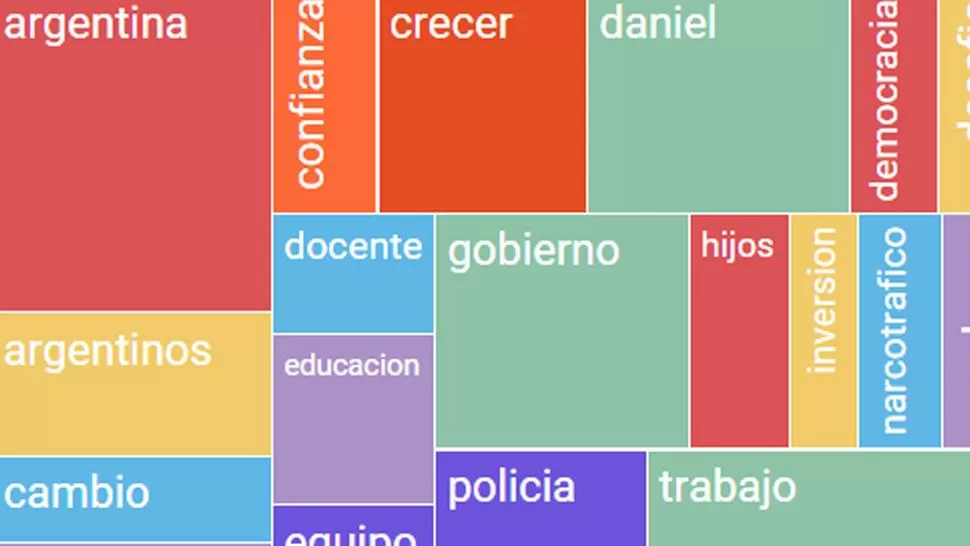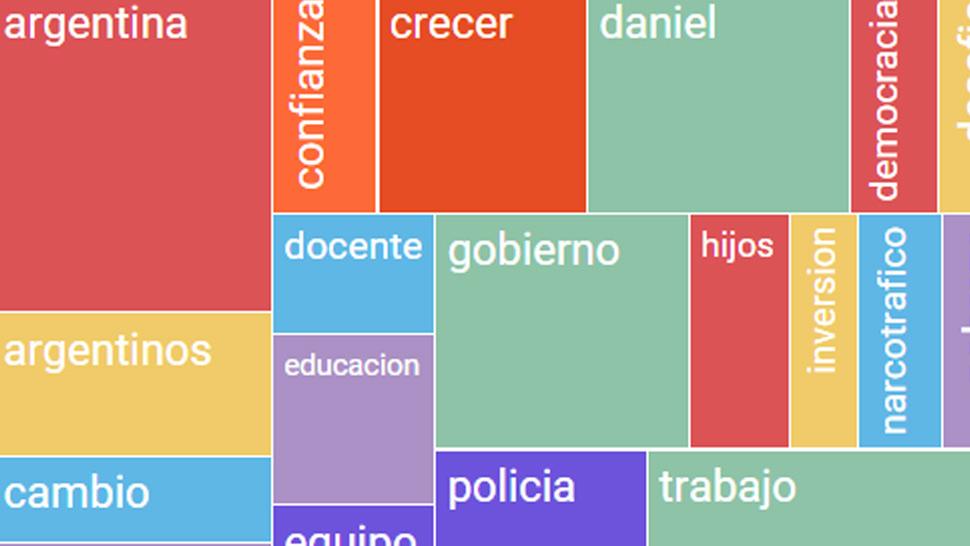 Durante la hora y media que duró el debate, Daniel Scioli pronunció 4.064 palabras y Mauricio Macri 4.678. Ambos candidatos expresaron sus ideas a lo largo de cuatro ejes temáticos y en cada uno de ellos sentaron sus posiciones con distintas frases que evidenciaron sus estrategias para el duelo mediático.