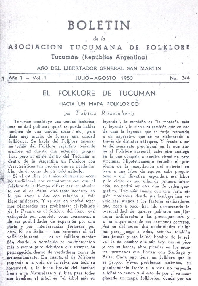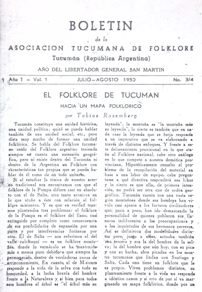 ERUDITA PUBLICACIÓN. Portada del primer número del “Boletín de la Asociación Tucumana de Folklore”, fechado mayo-junio de 1950. LA GACETA / ARCHIVO.