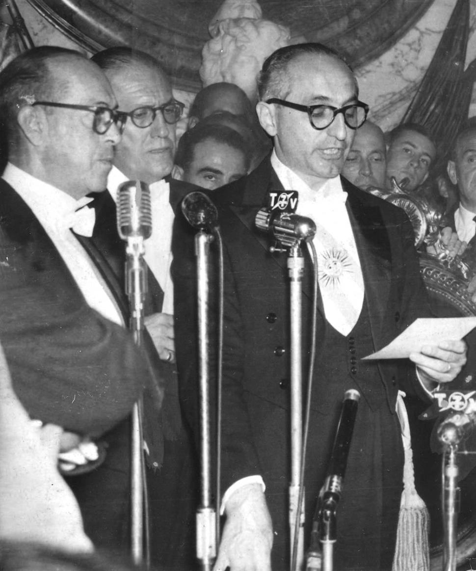 JURA ARTURO FRONDIZI. El 1 de mayo de 1958, vestido de frac, habla en la Casa Rosada luego de recibir la banda y el bastón. LA GACETA / ARCHIVO