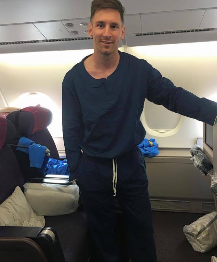 SE LO TOMÓ CON GRACIA. Messi publicó una foto del avión en el que viajaron a Japón con un pijama que le quedaba grande. foto del facebook de Leo Messi SE LO TOMÓ CON GRACIA. Messi publicó una foto del avión en el que viajaron a Japón con un pijama que le quedaba grande. foto del facebook de Leo Messi