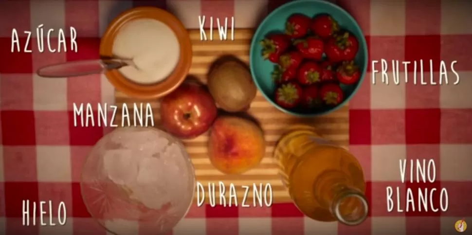 La receta paso a paso: Lavamos, pelamos y cortamos la fruta. En una jarra colocamos la fruta cortada, vertimos el vino con un poco de hielo y revolvemos ¿No entendiste nada? Mirá el video y seguí la receta ¡Y ahí está, listo para tomar!