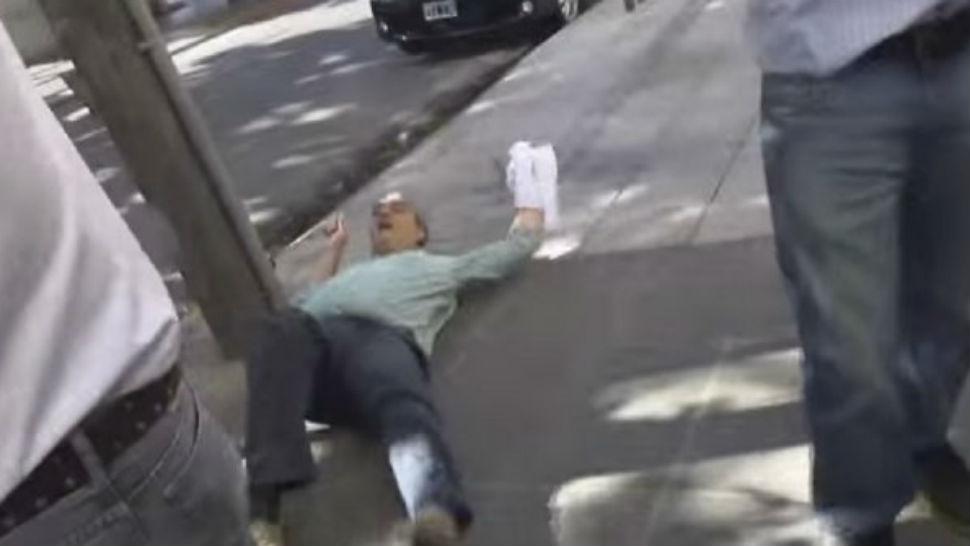 Sebastián Simone simuló ser agredido por un grupo de manifestantes que reclamaban por despidos. "Prensa, prensa, me empujaron", gritaba.