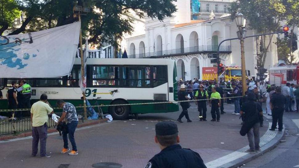 BUENOS AIRES.- Al menos cinco personas resultaron heridas luego de que un colectivo de la línea 91 que circulaba sobre Diagonal Norte, atropelló a dos ancianas que cruzaban Bolívar por lo que el chofer perdió el control e ingresó a la Plaza de Mayo donde se encuentra el acampe por Milagro Sala, embistiendo al menos a otras tres personas.