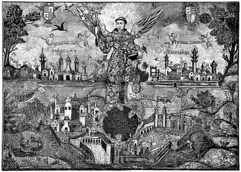 La segunda, sin fecha confirmada, pero seguramente no menos de una centuria después, es una pequeña porción de una obra de pintores de un taller de la zona del Collao. Durante gran parte de la colonia, esta zona alrededor del lago Titicaca, albergó importantes talleres de pintura, que se vendían en todo Sudamérica. El óleo que vemos, hoy se exhibe en una sala de la Academia Nacional de la Historia, en Buenos Aires. Aquí el venerado San Francisco Solano, reina espiritualmente sobre las ciudades de Paraguay y de Tucumán. El sacerdote franciscano que hiciera milagros a fines del siglo XVI, sobrevuela las tierras por las que peregrinó. Arriba a la derecha, una de las urbes tiene inscripto el nombre “Tucumán” y parece ser la misma, o similar a la que había imaginado Ayala mucho antes. El Museo Histórico de la Provincia Nicolás Avellaneda, tiene una pequeño grabado que repite la misma composición, de Solano y las dos ciudades, seguramente contemporáneo a la pintura.