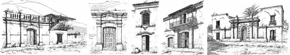 Luego de su declarado amor por la ciudad de Córdoba y su campaña, la de Salta fue sin dudas su segunda inspiración. Entre sus plumas, aparecen la conocida Capilla de San Bernardo, el Cabildo, una “casa histórica en Salta”, construcciones jesuitas y varios detalles de frentes, puertas y ventanas. También las casas particulares, como en Córdoba, fueron centro de su interés: la casa de los Cámara, de los Uriburu, de los Arias, de los Saravia, de los Otero, de los Mendiolaza. Publicamos algunas de ellas, como aparecieron en el libro “Arquitectura colonial en la Argentina”, editado en la ciudad de Córdoba, en 1982.
