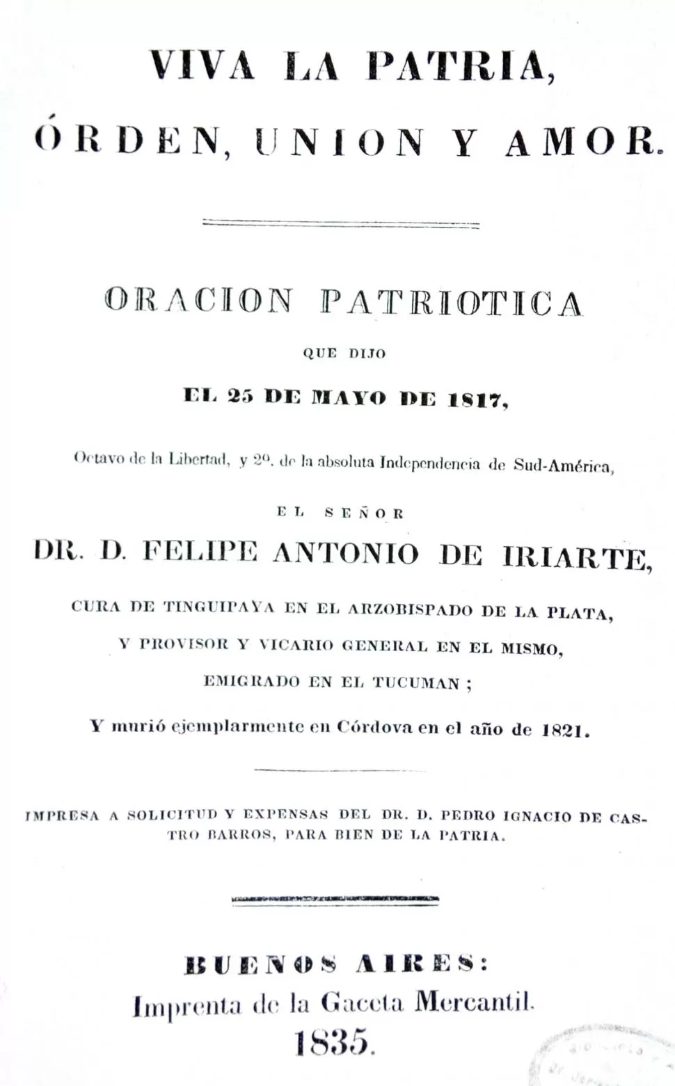 El doctor Felipe Antonio de Iriarte (1759-1821), ilustre jujeño, no alcanzó a firmar el acta de la Independencia del 9 de julio de 1816, como diputado por Chuquisaca, porque recién pudo incorporarse al Congreso el 6 de setiembre. Ya trasladado el cuerpo a Buenos Aires, le tocó pronunciar allí, el 25 de mayo de 1817, un elocuente sermón patriótico. Años más tarde, su colega congresal, Pedro Ignacio de Castro Barros, costeó la edición de la pieza, en un raro folleto de 33 páginas, titulado “Viva la Patria. Orden, unión y amor”. En el apéndice del mismo, se agregaban tres poemas de Castro Barrios: “Un ciudadano en el Tucumán en el Gran Día de América y su panegirista patriótico el ciudadano Dr. D. Felipe Antonio de Iriarte”, y dos breves, “Oda” y “Décima”.