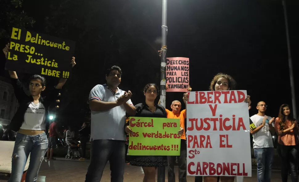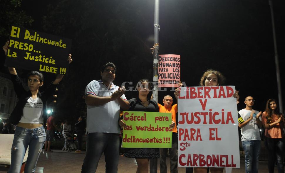 "Cárcel para los verdaderos delincuentes" y "Derechos humanos para los policías también", son algunos de los carteles que llevaron los manifestantes para pedir que sea liberado Carbonell, que se entregó horas después de producido el hecho. .