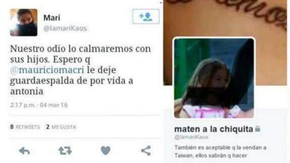 "Nuestro odio lo calmaremos con sus hijos. Espero q @mauriciomacri le deje guardaespalda de por vida a Antonia" y "Si algo hizo mal el kirchnerismo, es no haber matado a toda la burguesía, periodistas y políticos de derecha, en sus 12 años de gestión", escribió la acusada, entre otras frases.