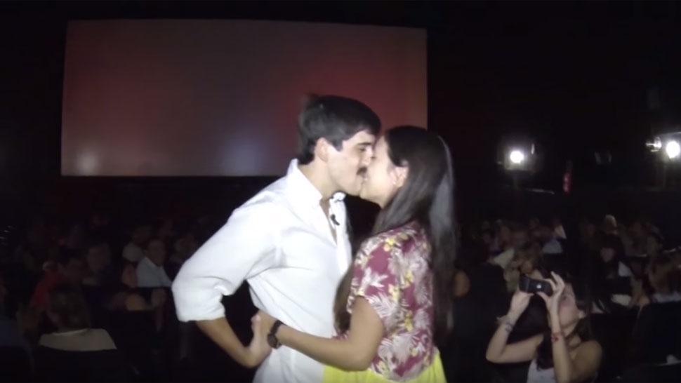 Después de los avances, y previo a la película, comenzó la proyección del video ideado por Francisco, que irrumpió en la sala después de permanecer escondido más de 45 minutos debajo de la pantalla. A media luz, "Fran" sacó los anillos del bolsillo y, formalmente, le pidió matrimonio a "Emi".