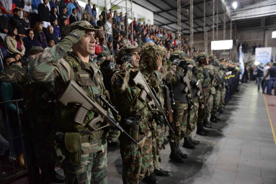 ENTONANDO EL HIMNO NACIONAL. Los efectivos de Gendarmería estuvieron presentes en el acto monterizo. foto de comunicación pública