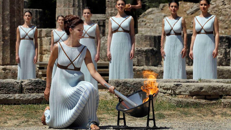 "Apolo, dios del sol y de la luz, manda tus rayos y enciende la antorcha para la hospitalaria ciudad de Río", dijo la intérprete griega Katerina Lechou, que luego entregó el fuego al primer relevista, el gimnasta griego Eleftherios Petrounias.