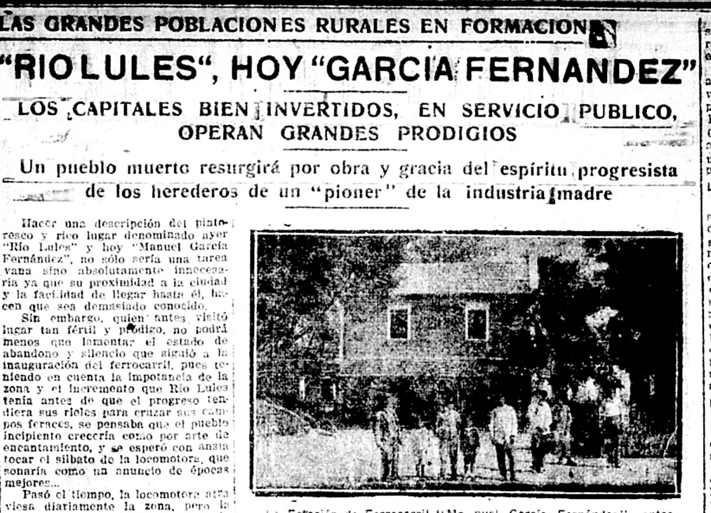 La noticia indicaba que propiciando el cambio del nombre de “Río Lules” se formó una comisión presidida por el Sr. Carlos María Padilla; los trabajos se realizaron con suerte hasta obtener del Ministerio la autorización para el cambio de nombre, y, en fecha 24 de diciembre del año pasado, en la estación del ferrocarril los antiguos letreros fueron cambiados con el nuevo nombre de la población que ahora se llama “Manuel García Fernández.